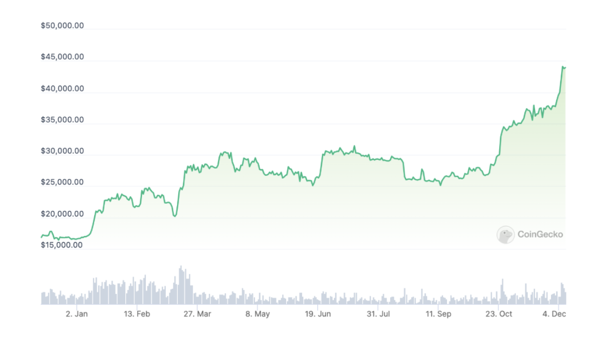 10月には、グレースケールが米国証券取引委員会(SEC)に対して行っていた裁判で勝訴。SECは控訴を断念し、同社のビットコイン投資信託(GBTC)のETF転換申請が前進する形となりました。このニュースは米国でのビットコイン現物ETF承認への期待を高め、市場は活気づき、BTCは約500万円に到達しました。