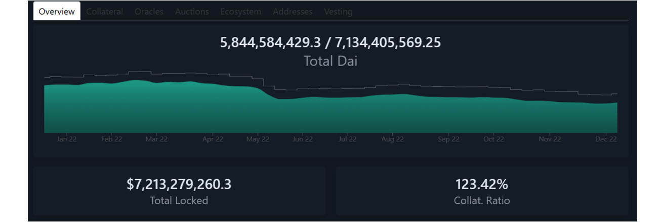このため、暗号資産担保型ステーブルコインでは担保とする暗号資産の価格が下落しても価値を保てるように「過剰担保」を導入する場合が多いです。DAIの場合、2023年6月16日時点でで160%以上の担保があることをオンチェーンデータから確認することができます。