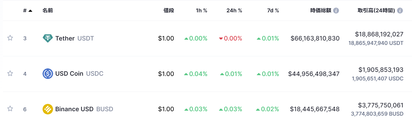 代表的な法定通貨担保型ステーブルコインは以下の通りです。いずれも米ドルに連動するステーブルコインであり、2023年6月16日時点で暗号資産の時価総額で上位にランクインしています。
